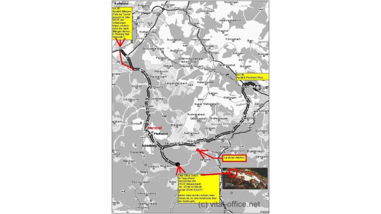 - b) Autobahn A5 Ausfahrt Ettlingen, Richtung Bad Herrenalb, In Marxzell links Richtung Straubenhardt, nach ca. 3km rechts ins Holzbachtal.