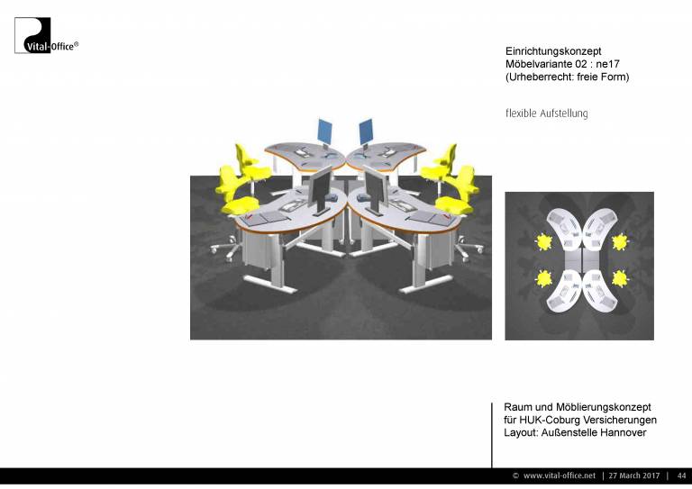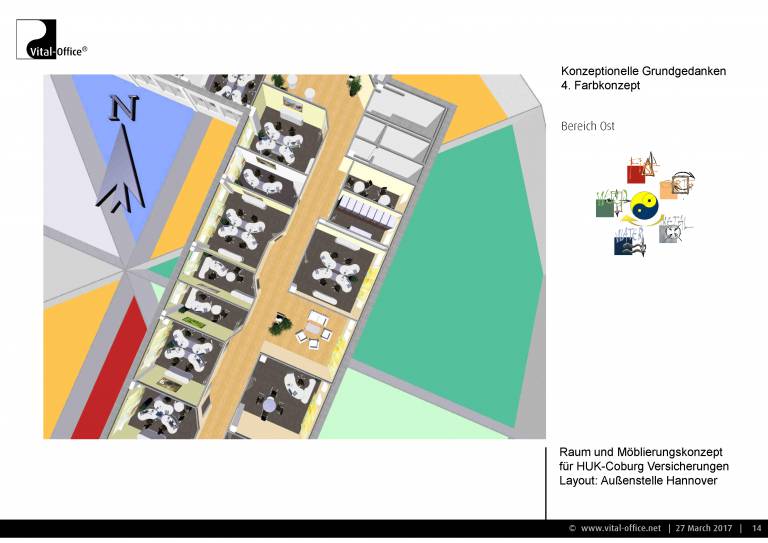 Beispielsweise sollte kein Mitarbeiter im „Durchzug“ sitzen, d.h., dass zwischen Tür und Mitarbeiter eine zumindest angedeutete Abgrenzung sein soll, die den Intimbereich schützt und damit auch zu mehr Konzentrationsfähigkeit ohne Störungen führt.
