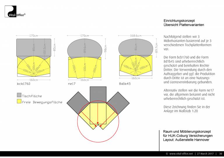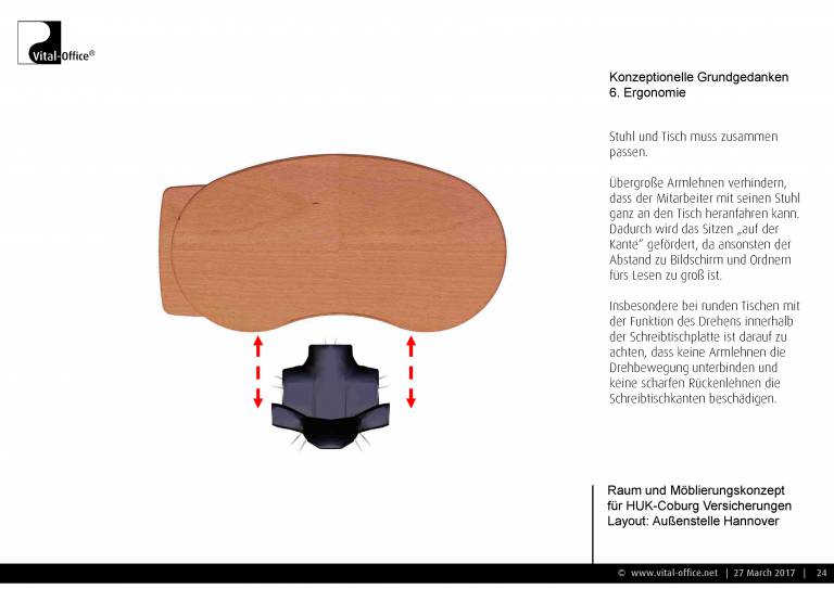 Insbesondere bei runden Tischen mit der Funktion des Drehens innerhalb der Schreibtischplatte ist darauf zu achten, dass keine Armlehnen die Drehbewegung unterbinden und keine scharfen Rückenlehnen die Schreibtischkanten beschädigen.