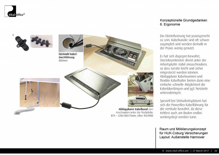 Es hat sich dagegen bewährt, Steckdosenleisten direkt unter der Arbeitsplatte stabil anzuschrauben, so dass Geräte leicht und sicher eingesteckt werden können. Abklappbare Kabelwannen und flexible Kabelhalter bieten dann eine einfache schnelle Möglichkeit die Kabelüberlängen und ggf. Netzteile unterzubringen.