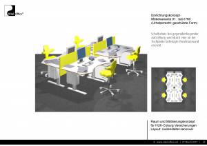 b) Aufstellung der Tische in einem Winkel, so dass die Mitarbeiter sich nicht direkt gegenüber sitzen und in verschiedene Richtungen sprechen.
