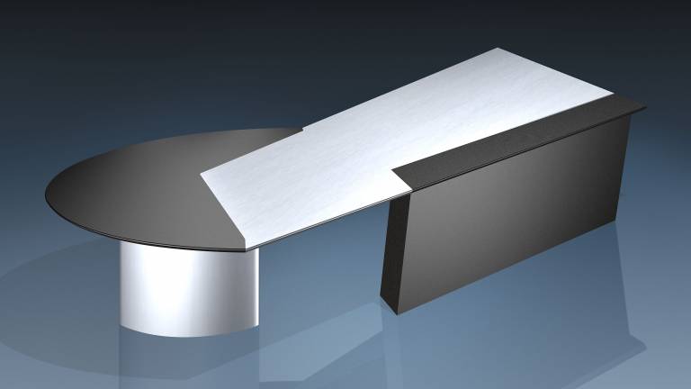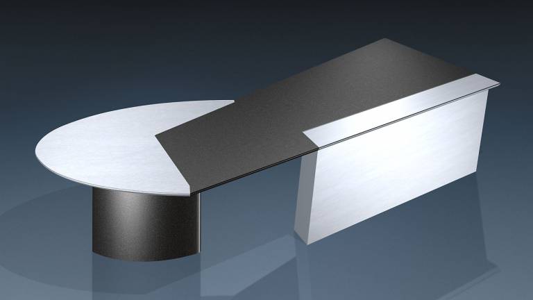 Elliptischer Fuß schwarz lackiert und schräggestellte Rückwand in Aluminium strichmatt.