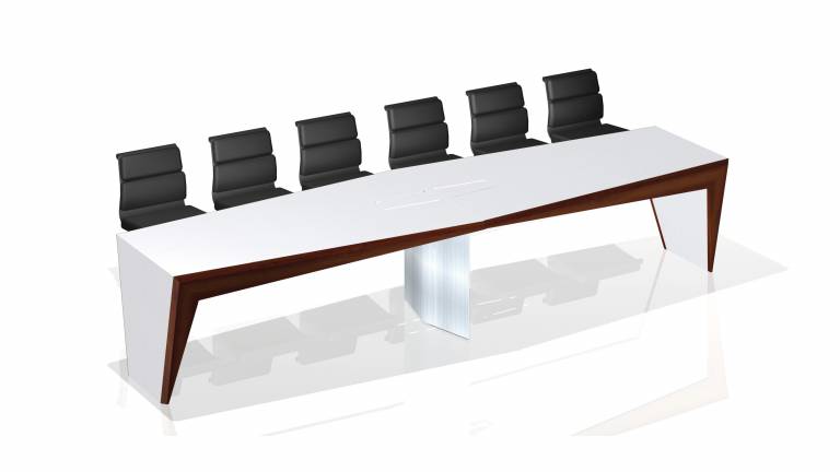 Klare Struktur, sinnlich ansprechend. Eine künstlerisch gestaltete Skulptur als Konferenztisch oder Besprechungstisch. Platte und Fuß als geschlossene Einheit. Außen, Oben und Innen gleich furniert, mit facettierten Wangen in verschiedenen Oberflächen. Der face Konferenztisch besteht aus 2 gespiegelten face Basistischen. Die Gesamtlänge des Konferenztisches kann individuell durch ein gerades Zwischenstück variiert werden.