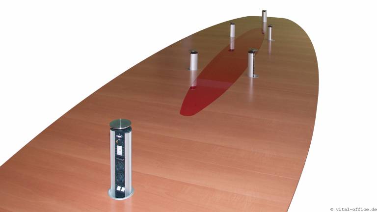 Konferenztisch für 22 Personen elliptische Bootsform 7,5x 1,8m mit rot lackierter Glaseinlage