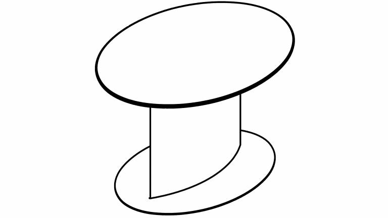 Elliptische Einsäulentische in Holz, Glas oder Linoleum, optional mit geschliffener Edelstahlbodenplatte.