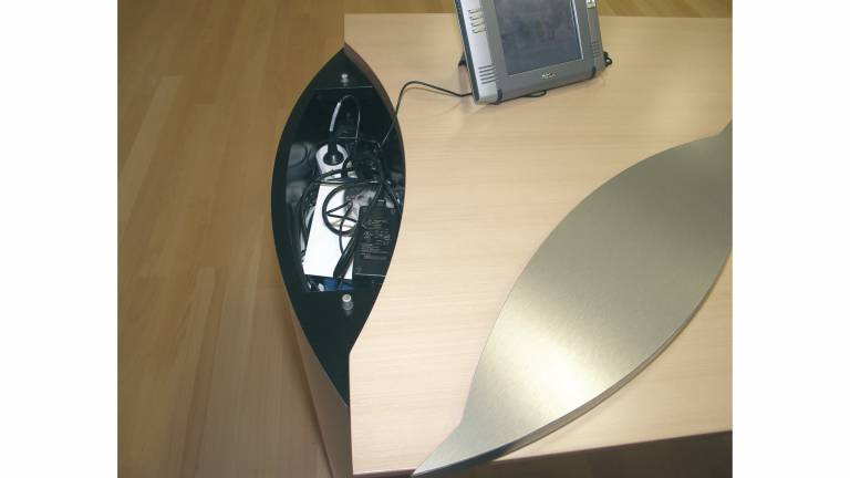 Elegante Chefschreibtische für z.B. Ärzte und Anwaltsbüros mit Elektro- und Datenanschlüssen im Fuß. Die Formteilfüße dienen als Kabelschacht. Ein ebenso besonderes Designmerkmal ist die sichtbare Abdeckung mit einfachem Zugang durch Wippfunktion.