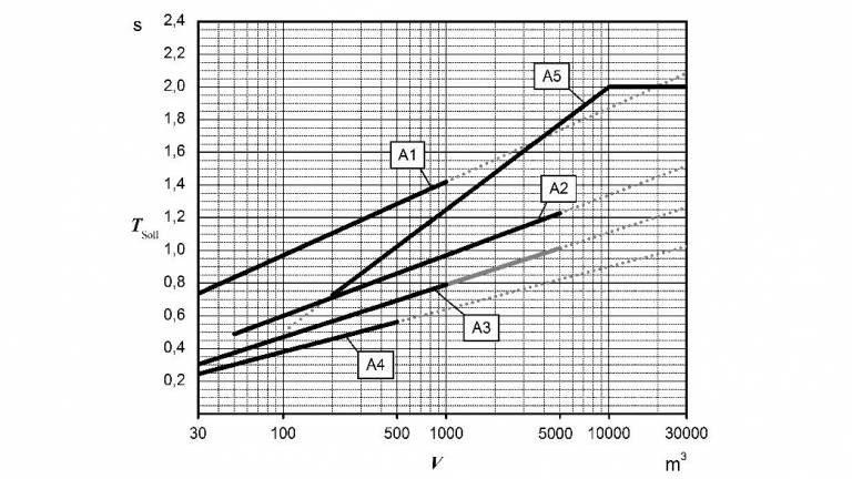 Der Sollwert T der Nachhallzeit ist bei Räumen der Gruppe A abhängig von Nutzungsart und Raumvolumen und bezieht sich auf den Zustand des Raums mit 80 % der Regelbesetzung. Die DIN 18041 spricht eine eindeutige Anforderung für den Verlauf der Nachhallzeit über der Frequenz bei Räumen der Gruppe A aus: Die Nachhallzeit sollte über alle Oktavbänder von 250 Hz bis 2000 Hz möglichst konstant mit einer Toleranz von ± 20 % sein; bei tieferen und höheren Frequenzen sind etwas größere Abweichungen tolerierbar. Die Sollwerte der Nachhallzeit für die fünf Nutzungsarten A1 bis A5 nach 4.2.2 sind nach den Gleichungen (siehe DIN 18041) in Abhängigkeit vom Volumen V zu berechnen. Der Nachweis der Einhaltung der geforderten frequenzabhängigen Nachhallzeit erfolgt nach den Vorgaben der DIN Anhang A während der Planungsphase rechnerisch und gegebenenfalls nach Fertigstellung des Raumes durch Messungen. Im Sinne dieser Norm ist die frequenzabhängige Betrachtung der Nachhallzeit zwingend erforderlich. Für die in dieser Norm behandelten Räume ist in der Regel ein linearer frequenzabhängiger Verlauf für die Nachhallzeit anzustreben. Jedoch beeinträchtigt ein moderater Anstieg der Nachhallzeit zu tiefen Frequenzen die Hörsamkeit nicht.Im Zweifelsfall sollten in Räumen zur Sprach-Information und -Kommunikation eher kürzere als längere Nachhallzeiten realisiert werden. Bei Mehrzwecknutzungen sind entsprechend der Wertigkeit der Hauptnutzung Zwischenwerte zwischen den Sollwerten zu ermitteln, sofern nicht durch variable akustische Maßnahmen die unterschiedlichen Anforderungen berücksichtigt werden. Die Nachhallzeiten gelten für die relevanten Nutzungsszenarien des Raumes unter Berücksichtigung der Schallabsorption der Möblierung und von Personen. Bei den Nutzungsszenarien sind insbesondere auch geringere Besetzungsdichten zu berücksichtigen, sofern diese zu erwarten sind.