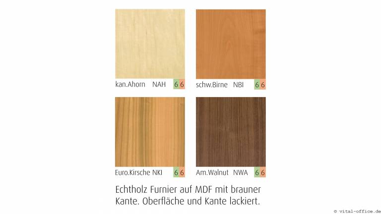 - Echtholz Furnier auf MDF mit brauner Kante. Oberfläche und Kante lackiert.