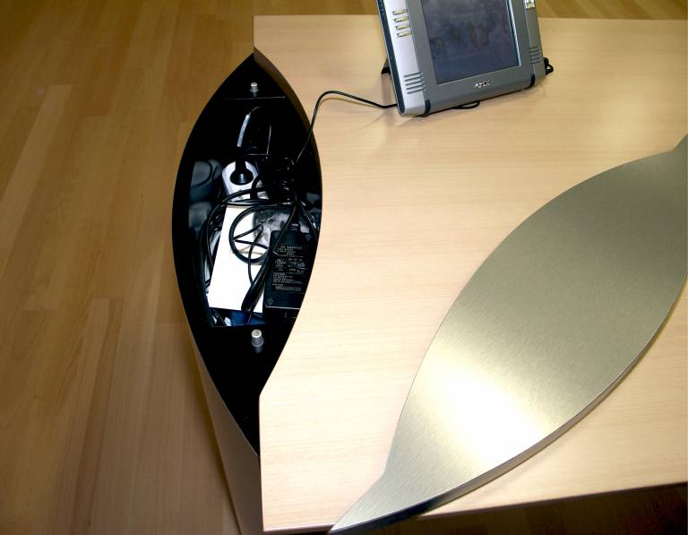 Die Formteilfüße als Kabelschacht mit sichtbarer Abdeckung mit einfachem Zugang durch Wippfunktion.
