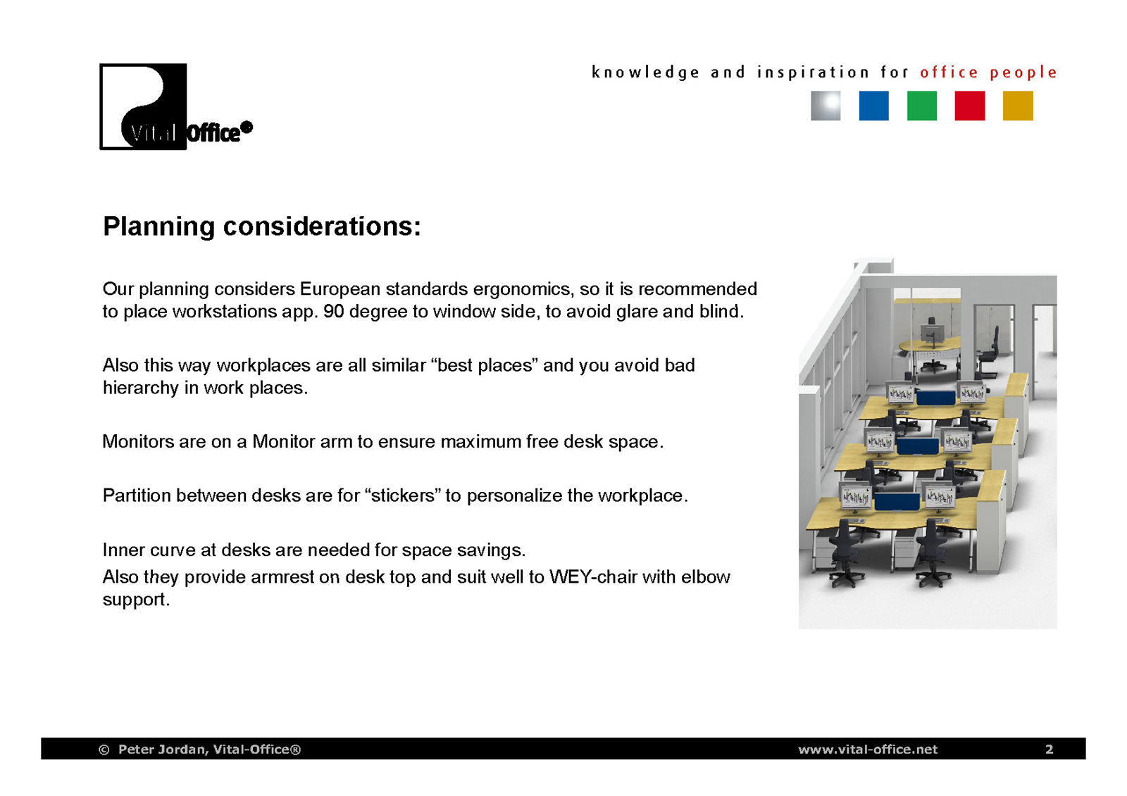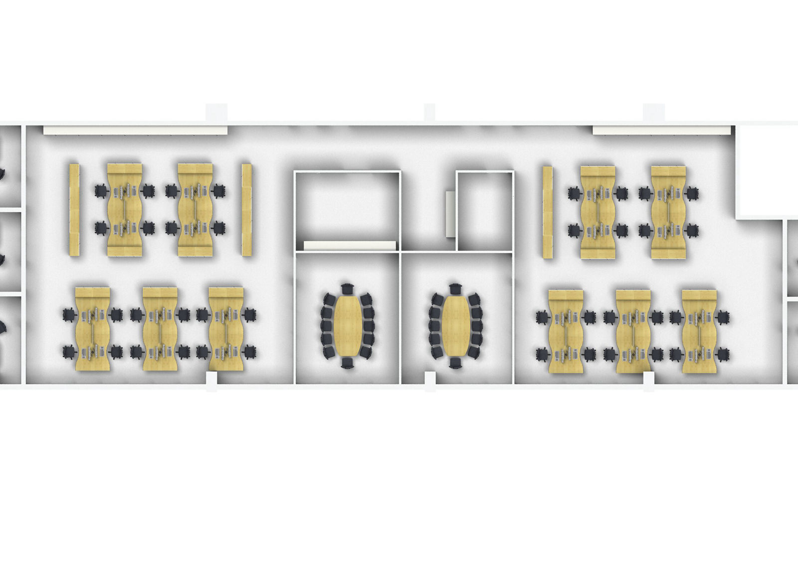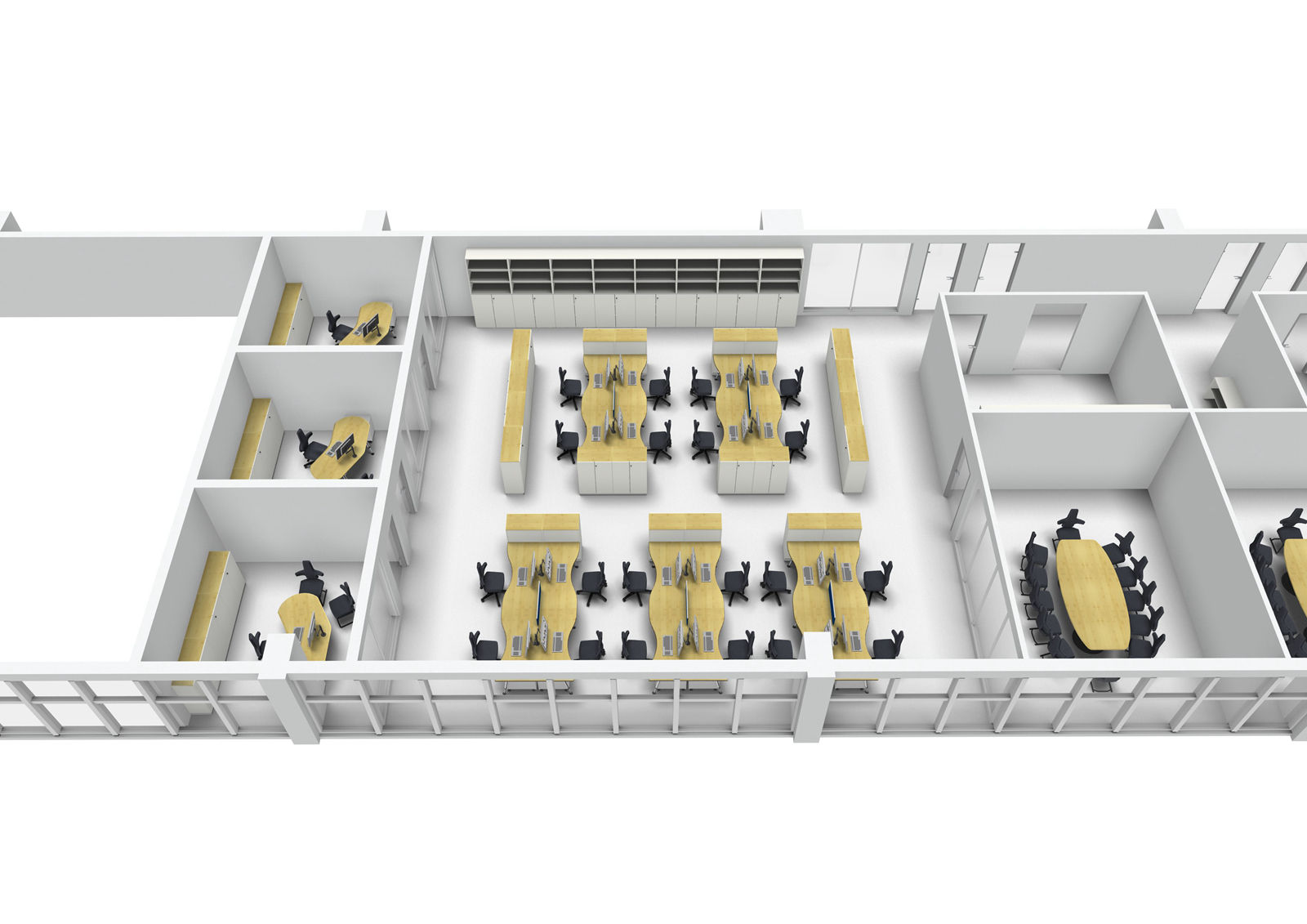 Customer's vision: Work benches for a large mount of employment, space and budget saving,functional office with sufficient storage .