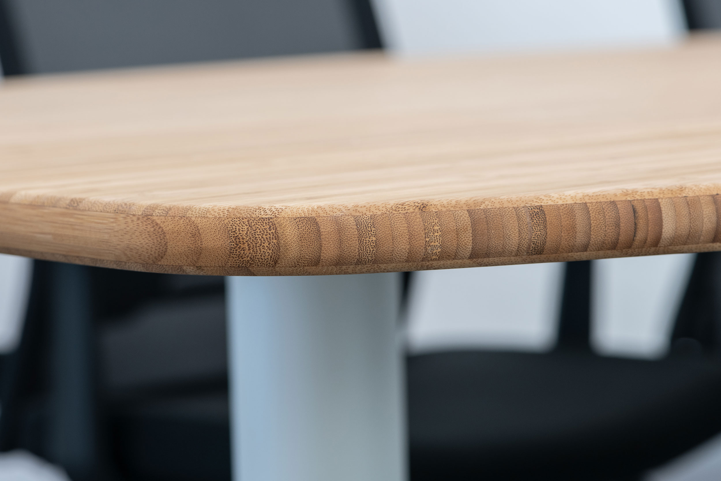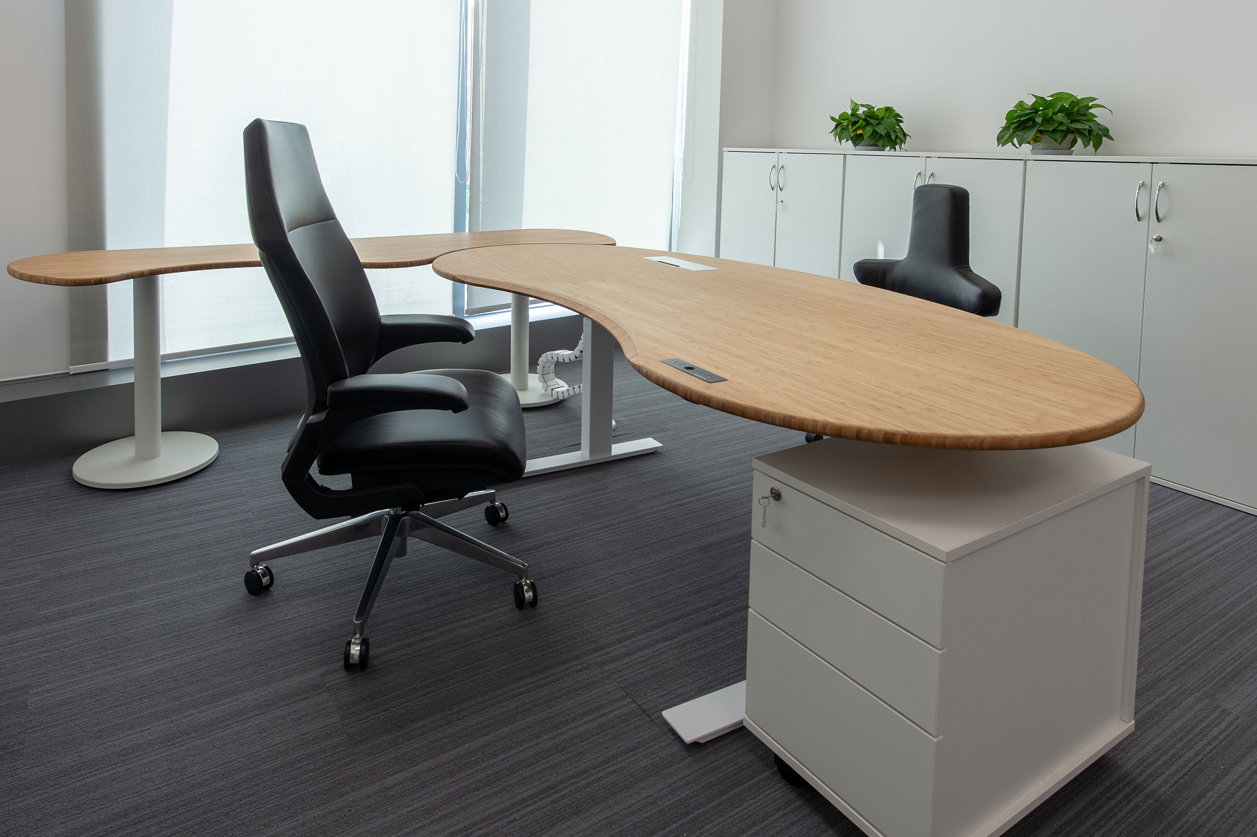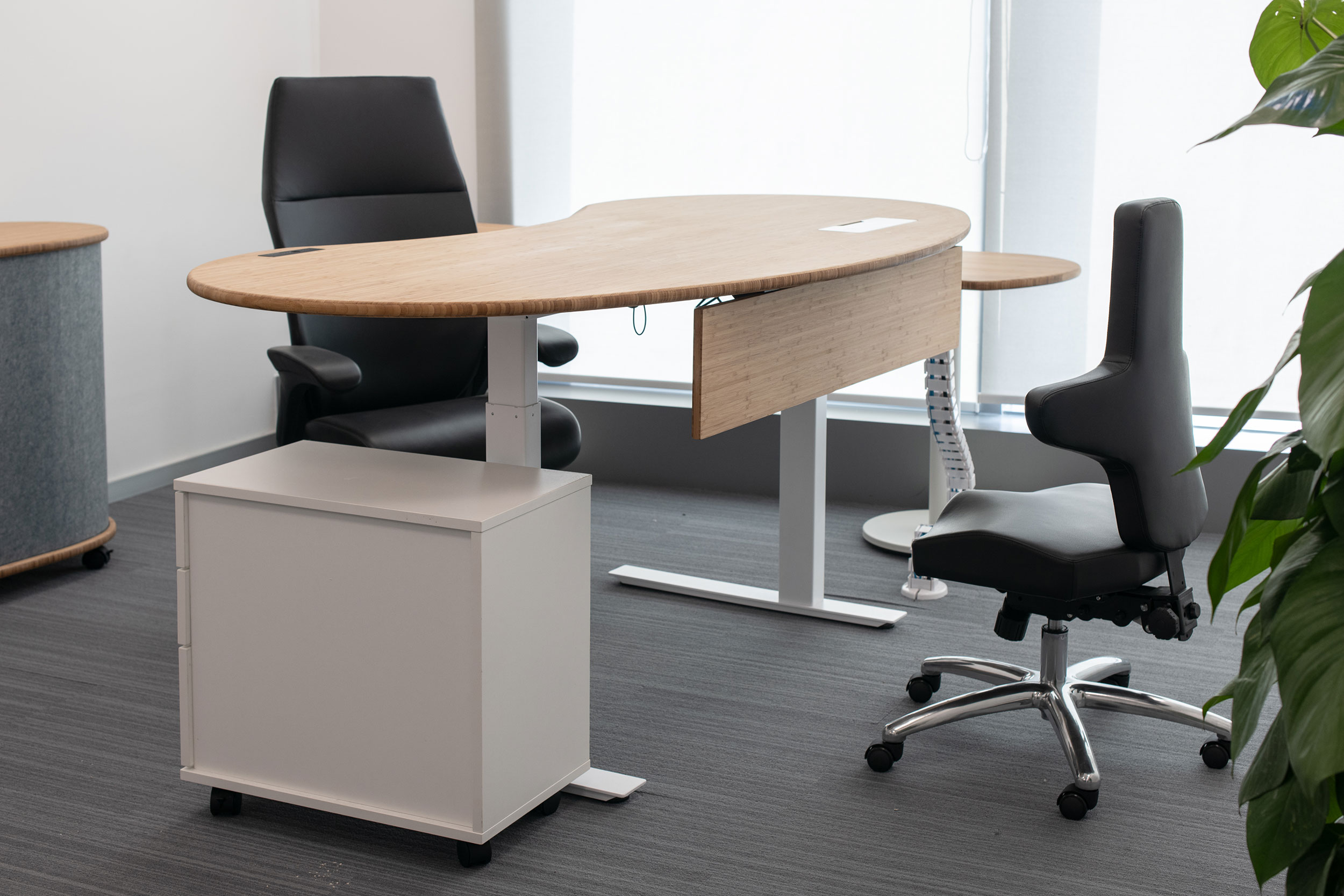 5 years after the furnishing of Jungheinrichs new factory, Vital-Office is again the supplier for Jungheinrichs new HQ and SO. Green bamboo desks are chosen again. Rectangular desk tops with height adjustable bases are added new. And the ergonomic saddle like WEY-chair was choosen again, but in 3rd generation technique and design. Electric installation and plug-in possibilities from top of table and from below table top was a special concern. Acoustic partitions are especially made for height adjustable stand-up desks. The acoustic panel is lifted always by the highest table top. This ensures, that all sticky notes on the screens are always available to the users on both sides.