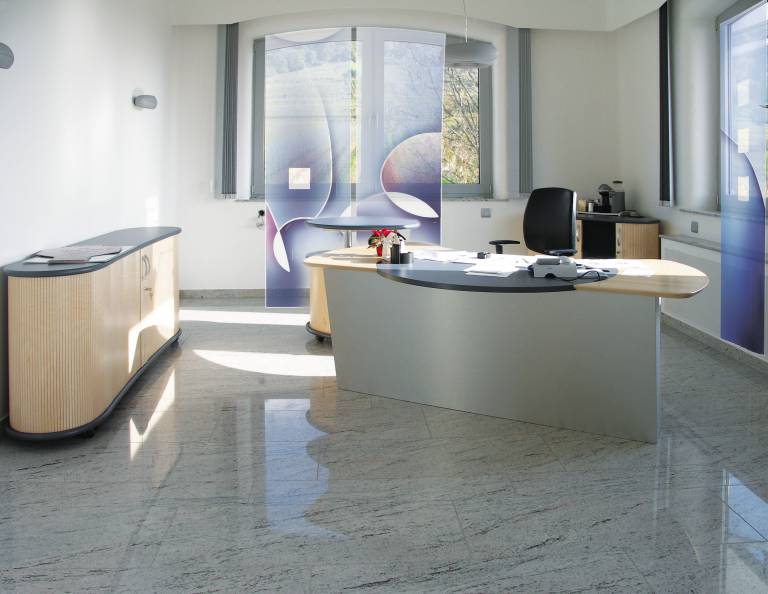 Die Pflege ist simpel: Fingerabdrücke lassen sich mit einer Lösung aus Wasser und Spiritus-Reiniger entfernen. Zudem sind Vital-Office-Flächenvorhänge schwerentflammbar, UV-stabilisiert und oberhalb einer relativen Feuchte von 40 Prozent neutral gegen statische Aufladung. Möglich macht das ein hydrophiler Wasserfilm auf der Oberfläche.