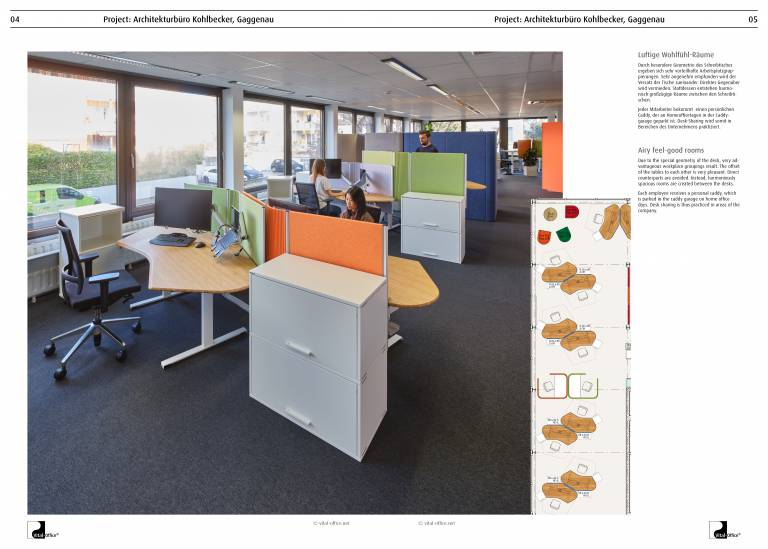 Durch besondere Geometrie des Schreibtisches ergeben sich sehr vorteilhafte Arbeitsplatzgruppierungen. Sehr angenehm empfunden wird der Versatz der Tische zueinander. Direktes Gegenüber wird vermieden. Stattdessen entstehen harmonisch großzügige Räume zwischen den Schreibtischen.