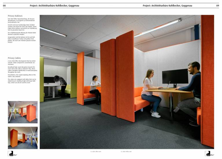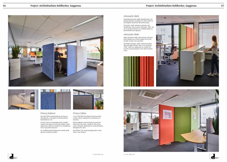 Eine Vital-Office Neuentwicklung, die bessere Akustikwerte, im Vergleich zu herkömmlichen Konstruktionen, hat. Erreicht wird eine breitbandige hohe Schallabsorption zum Raum hin und in der Kabine. Damit tragen diese Kabinen wesentlich zur Schallabsorption im gesamten Raum bei.
