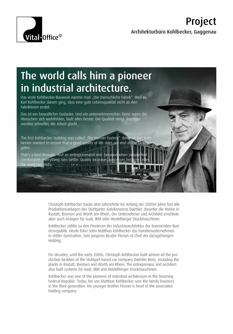 Christoph Kohlbecker baute über Jahrzehnte bis Anfang der 2000er-Jahre fast alle Produktionsanlagen des Stuttgarter Autokonzerns Daimler, darunter die Werke in Rastatt, Bremen und Wörth am Rhein. Der Unternehmer und Architekt errichtete aber auch Anlagen für Audi, IBM oder Heidelberger Druckmaschinen. Kohlbecker zählte zu den Pionieren der Industriearchitektur der boomenden Bundesrepublik. Heute führt Sohn Matthias Kohlbecker das Familienunternehmen in dritter Generation. Sein jüngerer Bruder Florian ist Chef der dazugehörigen Holding.