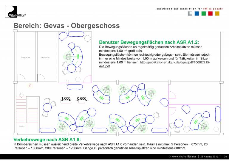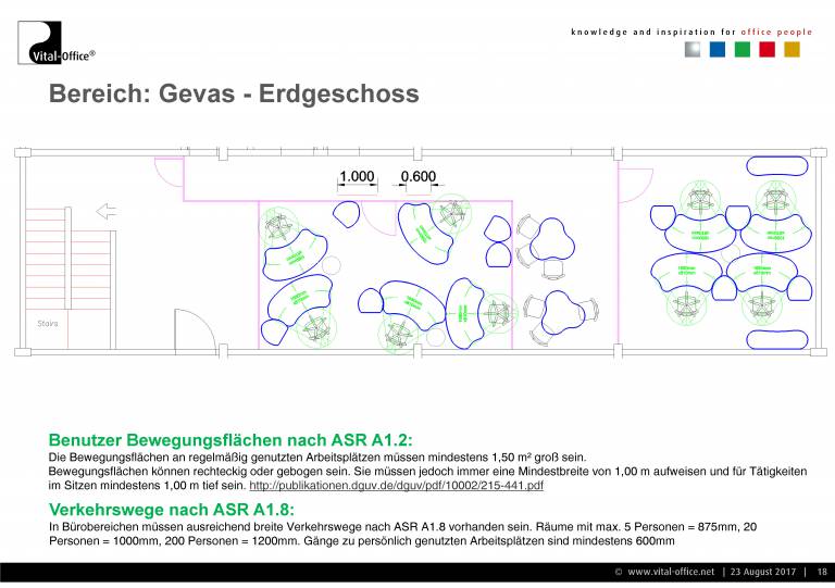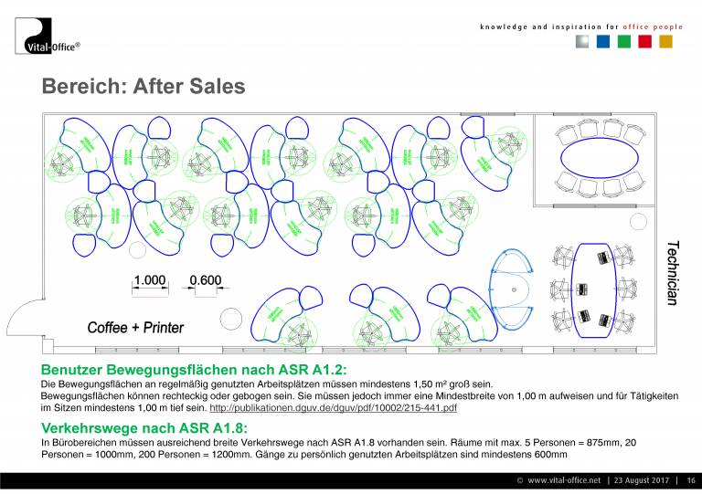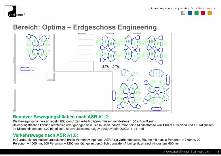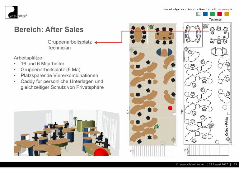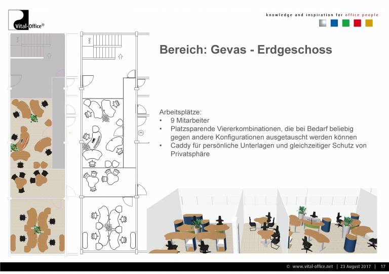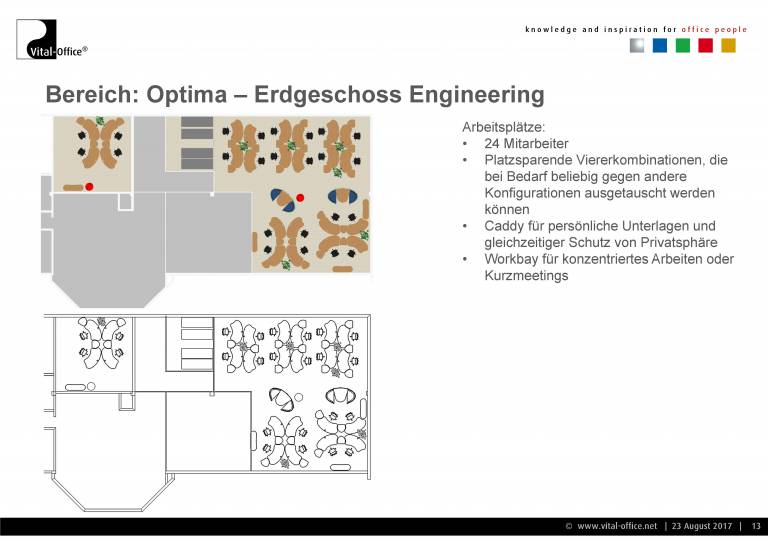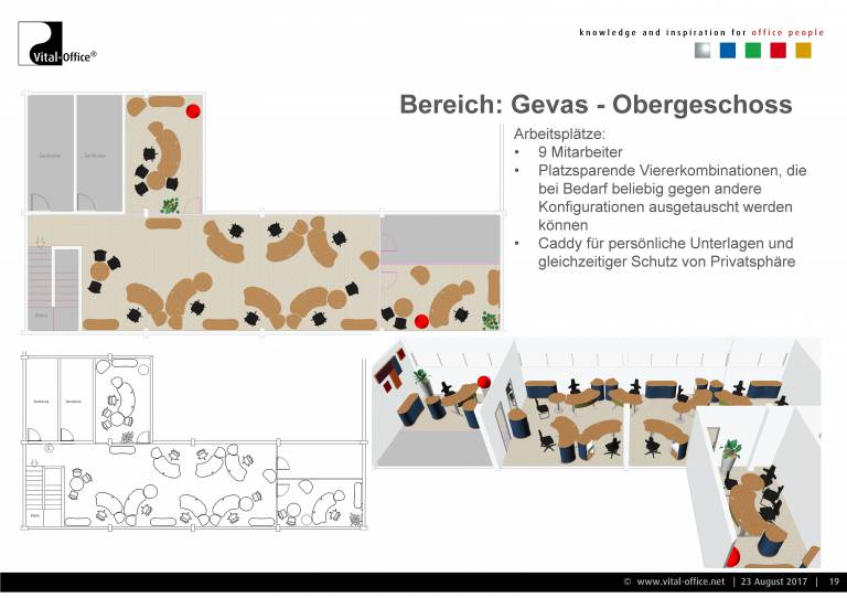 Planung und Ausführung einer neuen Einrichtung für die Verwaltung. Zukunftsorientiert unter Berücksichtigung von Change Management (Wachstum Plus/Minus, Verlagerung, Umzug, Neubau, veränderte technische Arbeitsmittel wie z.B. UHD Monitors für Konstrukteure, Home-Office, Leisure working, Team-Work enhancements, VR, uvm.) und Cultural Aspects (Company and Country), sowie Ergonomie (Steh- Sitzarbeitsplätze) und Raumakustik (Akustikmöbel). In der Praxis sprechen wir diese Punkte in unseren konkreten Gesprächen an und lassen die Ergebnisse in Konzept und Planung einfließen.