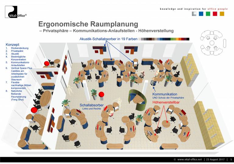 Vor Ort wurde eine erhöhte Sensibilität der Mitarbeiter bezüglich der Raumakustik festgestellt. Eine übliche abgehängte Decke mit leicht absorbierenden Platten ist jedoch bereits vorhanden. Da es darüber hinaus keine relevanten größeren Flächen gibt, die für zusätzliche Akustikmaßnahmen geeignet wären, wurde das Möblierungskonzept mit Akustikmöbeln erstellt. Jeder der höhenverstellbaren Schreibtische bekommt einen Akustikcaddy mit 1.22m² höchst absorbierender Akustik direkt an jedem Arbeitsplatz. Darüber hinaus sind weitere Möbelkomponenten schallschluckend.