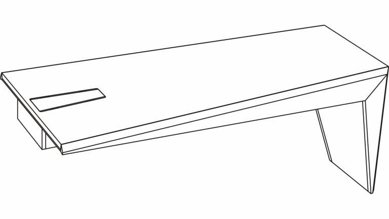 Klare Struktur, sinnlich ansprechend. Eine künstlerisch gestaltete Skulptur als Besprechungstisch oder Schreibtisch. Platte und Fuß als geschlossene Einheit. Außen, Oben und Innen gleich furniert, mit facettierten Wangen in verschiedenen Oberflächen.