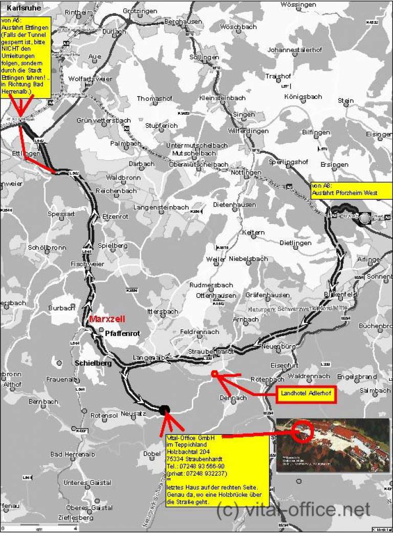 b) Autobahn A5 Ausfahrt Ettlingen, Richtung Bad Herrenalb, In Marxzell links Richtung Straubenhardt, nach ca. 3km rechts ins Holzbachtal.
