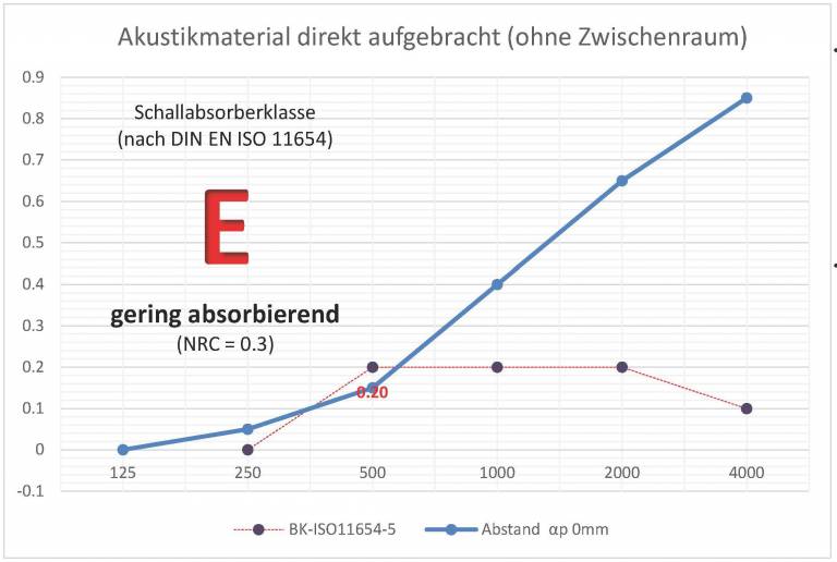 Eine gute Schallabsorption wird erst durch die korrekte wirksame Anwendung der Absorbermaterialien erreicht! Werden absorbierende Materialien direkt auf eine harte Fläche aufgebracht, beschränkt sich die Absorption auf die hohen Töne. (siehe Grafik) Der Absorptionsgrad wird mit Klasse E als gering absorbierend klassifiziert.