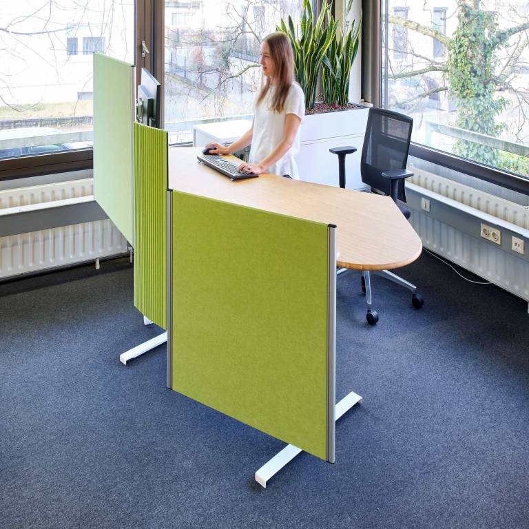 Ergänzt mit einer darüber abgehängten Lichtbaffel ist alles perfekt, was für einen ergonomischen und nachhaltig umweltfreundlichen modernen Arbeitsplatz erforderlich ist.