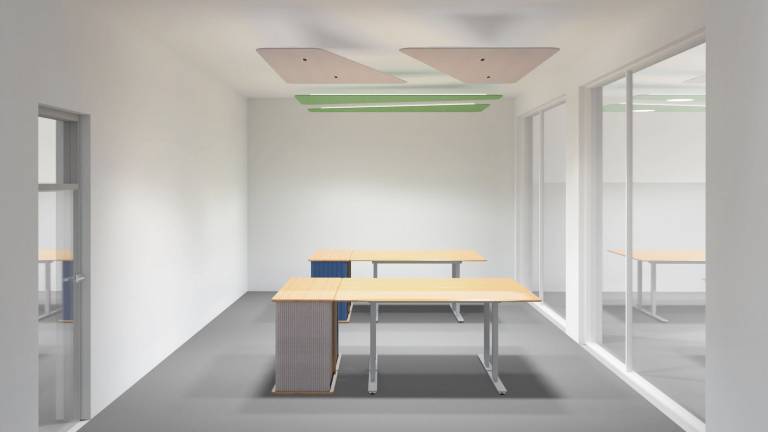 Deckensegel im richtigem Abstand zur Decke montiert, sind optimale breitbandigen Schallabsorber, die auch die tiefen Sprachfrequenzen gut absorbieren.
